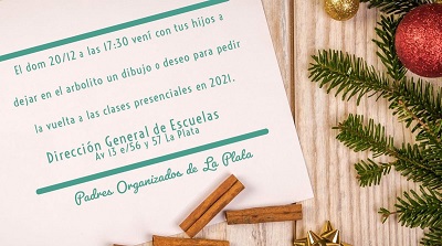 La cita es este domingo 20/12 a las 17.30hs. en 13 y 56 donde será instalado el árbol de deseos. Quienes no puedan asistir, pueden enviar dibujos y deseos o cajas de regalos para colocar en el árbol a través de las cuentas @PadresOrgLP.