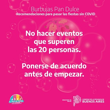 Frente a la proximidad de las fiestas y el aumento de los casos de coronavirus, el Ministerio de Salud de la Provincia emitió una serie de propuestas denominadas “burbujas pan dulce” apelando a la solidaridad de los bonaerenses para evitar la transmisión del virus en los encuentros familiares y con amigos. Estas se suman a la campaña de difusión lanzada para este verano con el ABCD para cuidarnos en pandemia.