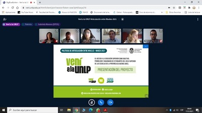 María Eugenia Ramallo, directora de Vinculación con el Nivel Medio de la UNLP, detalló que desde el área se llevó a cabo la Presentación del Proyecto, por videoconferencia, con representantes de la cartera de educación bonaerense, a fin de dar a conocer el proyecto de articulación entre niveles Vení a la UNLP. El acceso a la educación superior como objetivo, posibilidad e imaginario de estudiantes del ciclo superior de las escuelas de la provincia de Buenos Aires.