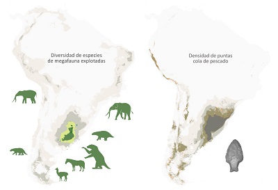 Lo interesante -destacan los científicos- es que la tecnología de puntas Cola de Pescado apareció en América del Sur alrededor hace 13.000 años y muestra una rápida amplificación de la densidad hasta alcanzar el pico de distribución entre 12.400 y 12.200 años atrás. Es decir, que el descenso de megafauna coincide ajustadamente con la aparición de los cazadores con puntas Cola de Pescado.