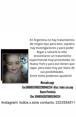 Para ello se está realizando una colecta y el objetivo de la misma es reunir la suma de 110.000 dólares. Cabe destacar que quienes puedan y quieran brindar su aporte para ayudar a esta familia, podrán hacerlo a través del CVU de Mercado Pago: 0000003100032809462314-Usuario: TODOS.X.EZRA,MP .