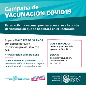 La Universidad Nacional de La Plata, en coordinación con el ministerio de Salud de la provincia de Buenos Aires, pondrá en funcionamiento a partir del jueves 6 de agosto una posta de vacunación COVID-19 propia para mayores de 18 años.