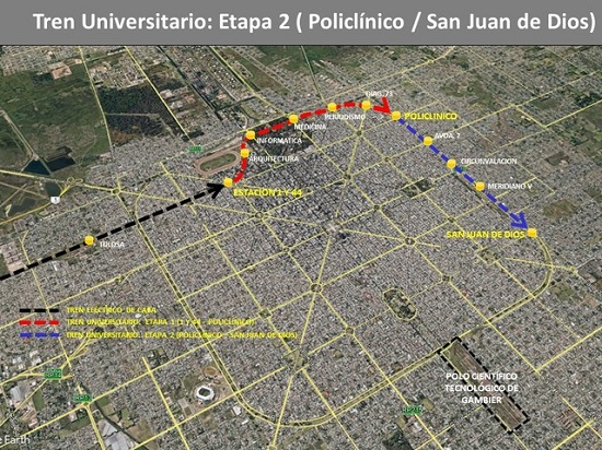 La formación, que desde la Estación de 1 y 44 llega hoy hasta el Policlínico San Martín ubicado en 1 y 72, una vez finalizado el Proyecto completo sumará unos 7 kilómetros de recorrido para llegar al corazón del predio de los Talleres Ferroviarios de Gambier, donde se erigirá el Polo Científico Tecnológico Universitario.La finalidad es acercar el ferrocarril a Los Hornos por lo que se proyectó una última parada a la altura de 137 y 52. A su vez se prevé la apertura de la avenida 137 para vincular los barrios de Gambier y Los Hornos.