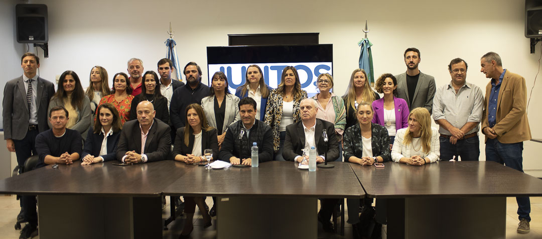 Los presidentes de los bloques de Juntos en la Legislatura provincial, Alejandro Rabinovich y Maximiliano Abad, encabezaron la presentación y estuvieron acompañados por los senadores y diputados de cada bloque.