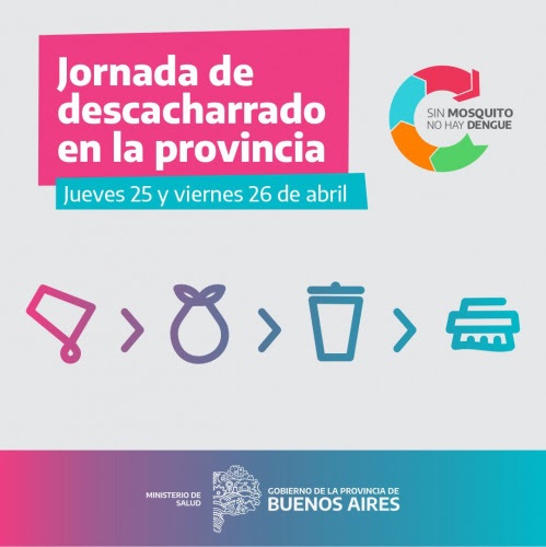 El ministerio de Salud de la Provincia pondrá en marcha este jueves y viernes, 25 y 26 de abril, una nueva estrategia de descacharrado en distritos bonaerenses, con la participación de hospitales e instituciones. El objetivo es eliminar todos aquellos recipientes que acumulen agua dentro y fuera de casa, ya que el mosquito vector del dengue tiene hábitos domiciliarios.