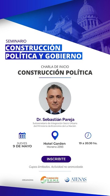 Confirmaron para el punto de partida al Dr. Sebastián Pareja, actual subsecretario de Integración Socio Urbana del Ministerio de Economía de la Nación y principal armador político de La Libertad Avanza en la provincia de Buenos Aires quien dará su disertación sobre “Construcción Política”.