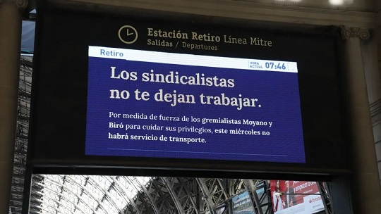 La senadora nacional Juliana di Tullio denunció penalmente al Presidente de la Nación y a la Ministra de Seguridad por el envío de mensajes a través de la app “Mi Argentina” y de las pantallas informativas en las estaciones ferroviarias durante el último paro de transporte del 30 de octubre con el texto: “Los sindicalistas no te dejan trabajar. Por medida de fuerza de los gremialistas Moyano y Biró para cuidar sus privilegios, este miércoles no habrá servicio de transporte. Si te obligan a parar, llamá al 134”.