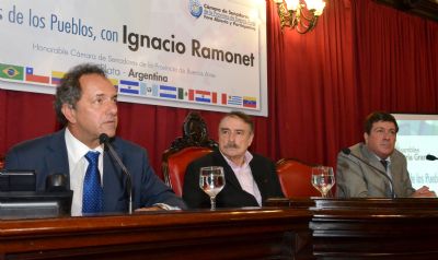 Con la presencia de Daniel Scioli, el vicegobernador Gabriel Mariotto recibió en el Palacio legislativo al escritor y periodista Ignacio Ramonet, quien realizó una Conferencia Magistral en el marco de una nueva edición de Asamblea Patria Grande. “La filosofía que se expresa en los pueblos y esa vocación histórica de integración hoy le da esperanza al mundo”, expresó el Presidente del Senado. En la presentación del evento que tuvo lugar en el recinto de sesiones, Scioli felicitó a Mariotto “por el aporte que hace a nuestra provincia para ayudarnos a reflexionar, abriendo espacios de representación, sin limitarse al debate clásico parlamentario, sino también abriendo sus puertas a intelectuales como Ignacio Ramonet”. “Agradezco tu compromiso y que le hayas dado esta impronta al Senado de la provincia, no solamente construyendo consensos para garantizar las leyes, sino propiciando encuentros como Asamblea Patria Grande”, sostuvo el titular del ejecutivo provincial, quien previamente inauguró junto a Mariotto el Espacio para la Memoria y Promoción de los Derechos Humanos en la Comisaría Quinta de La Plata, establecimiento donde funcionó un Centro Clandestino de detención y tortura. En el marco de la charla, se presentó el libro que compendia los momentos más destacados de la primera edición del Festival Popular Asamblea Patria Grande, que tuvo lugar en octubre del año pasado y reunió a funcionarios políticos, organizaciones comunitarias y artistas destacados de toda la región. En la antesala de la Conferencia Magistral, el Vicegobernador aseguró que “la teoría se hace práctica con la ley de medios, con los movimientos de cultura popular y esa trama con círculos concéntricos va articulando una resistencia, que pasa a ser - con el voto popular - la oportunidad de gobernar nuestros países”. En esa línea, el titular del Senado sostuvo que “tenemos que seguir gobernando Argentina y América Latina, para continuar el camino que marcaron los patriotas”. Durante su exposición, Mariotto cuestionó las expresiones que en América Latina quieren condicionar a los gobiernos elegidos democráticamente. “Traen a líderes de la derecha europea para explicarnos por qué tenemos que abandonar el MERCOSUR, UNASUR y el fracaso de nuestra vocación de unión continental, para que nos unamos a la alianza del pacífico, que es el nuevo ALCA”. “Es un lujo tener a Ignacio y que podamos reflexionar. Mucho de los que actuamos políticamente tienen que ver con grandes charlas que tuvimos con él”, remarcó el Vicegobernador y ponderó el papel que ocupa el Papa Francisco como líder mundial. “La periferia europea está nutriéndose de lo que predica nuestro Papa latinoamericano”, dijo. Ante un recinto colmado, Ignacio Ramonet comenzó su exposición haciendo referencia al discurso que pronunció Mariotto en el Foro Internacional de Televisión (TV Morfosis) realizado en México, donde el experto en medios le entregó al Vicegobernador un escrito sobre lo que fue su visita al Papa Francisco en el Encuentro Mundial de Movimientos Populares. “Mariotto hizo un discurso de apertura extraordinariamente inspirado por un sentimiento nuestro americano, como decía Chávez. Y me pareció que era portador de ideas necesarias no sólo para las causas de los humildes en Argentina, sino para las causas de todos los pueblo en América Latina”, afirmó. “En el sur de Europa, frente a las políticas de crisis han surgido fuerzas inspiradas en los procesos latinoamericanos que han logrado detener al neoliberalismo y su destrucción social”, aseguró el Director de Le Monde Diplomatique y autor de más de una decena de libros, que se han traducido en distintas lenguas. Sobre la políticas de ajuste que aún siguen instrumentándose en distintos puntos del globo, Ramonet explicó que “las políticas de austeridad han servido a pagar a los acreedores, a los bancos. Los bancos ya han cobrado en base al sufrimiento de las sociedades de los países europeos, en especial de los países de Europa del sur”. En esa línea, el catedrático expuso que “no se puede permitir que en esta Latinoamérica integrada gracias a Néstor Kirchner, Fidel Castro, Lula Da Silva y Hugo Chávez pueda debilitarse”. Además, advirtió sobre la actuación de poderes que intentan desestabilizar a los gobiernos populares y detener los procesos de cambio en Latinoamérica. “Hoy vemos fuerzas nuevas, el poder financiero, pero también el poder judicial que en muchos países al no haber cambiado las constituciones está apoyando a las fuerzas más conservadoras para permitir que se establezcan ofensivas contra gobiernos democráticos”, explicó. Por último, Ignacio Ramonet ponderó la experiencia de la Ley de Medios argentina, a la que consideró un ejemplo para Latinoamérica y el mundo. En la Conferencia Magistral desarrollada en el recinto estuvieron presentes la Ministra de Gobierno bonaerense, Cristina Álvarez Rodríguez; la Directora General de Cultura y Educación de la Provincia, Nora de Lucía; el intendente de La Plata, Pablo Bruera y el concejal local, Gabriel Bruera. Además, formaron parte de la Conferencia los Senadores Cristina Fioramonti, Santiago Carreras, Emilio López Muntaner, Alejandro Di Chiara, Cecilia Comerio, Gustavo Oliva, Patricio García, Alberto De Fazio, Marcelo Carignani, Marina Moretti, Gervasio Bozzano, Jorge Ruesga; y los Diputados provinciales Gustavo de Marzio, Alicia Sánchez y Graciela Rego. También, formaron parte del acto el Juez en lo Contencioso Administrativo Luis Arias; el Coordinador General de Fútbol para Todos, Pablo Paladino; el Subsecretario de la Fiscalía de Estado, Leonardo Clemente; el Director del Banco Provincia, Omar Galdurralde; el Vicedecano de la Facultad de Ciencias Sociales de Lomas de Zamora, Francisco Lavolpe; el interventor del Instituto Manuel Dorrego, Carlos Caramello; el Director de Radio y Televisión Argentina, Alej