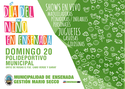 El Municipio de Ensenada realizará el festejo del Día del Niño el próximo domingo 20 de Agosto, desde las 14 horas, en el Polideportivo de dicho partido, ubicado en las Calles Ortiz de Rosas y Pasaje Cabo Verde, con entrada libre y gratuita. La celebración contará con la participación del Mago Guerra, el Mago Emilio, la obra de teatro Una Vieja Musical, el Circo Alboroto y el grupo musical Versión Cumbia.