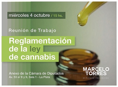 El próximo miércoles 4 de Octubre, el Diputado provincial por el FpV, Marcelo ‘Patón’ Torres, ha organizado una reunión de trabajo sobre la reglamentación de la Ley de Cannabis Medicinal, en las Salas 1 y 2 del Edificio Anexo de la Cámara de Diputados de la Provincia de Buenos Aires (Av. 53 e/ 8 y 9) y desde las 15 horas.