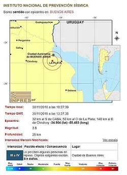 Fuentes del Instituto Nacional de Prevención Sísmica informaron al diario “El Día”, que se trató de un sismo de 3.8 grados que impactó a 32 km al sur de Capital Federal y a 50 km al oeste de la ciudad de La Plata, habiendo alcanzado una profundidad de 25 km.