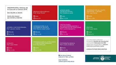 De 10 a 14 hs, en calle 45 nº 582, entre 6 y 7, los interesados pueden anotarse en: joyería contemporánea; mosaico; producción poética; introducción a la guitarra y ukelele; introducción a la moldería y confección femenina; vitrofusión; cantautores, acompañamiento y composición de canciones; fotografía básica; introducción al canto individual y grupal, pintura.