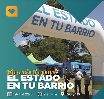 “El Estado en tu Barrio” se instalará del martes al viernes próximo en el ingreso al Mercado Regional La Plata, ubicado en Av. 520 y 116, en el horario de 9 a 14 horas, en pos de otorgarles la posibilidad a los ciudadanos de realizar trámites y gestiones en su propio barrio.