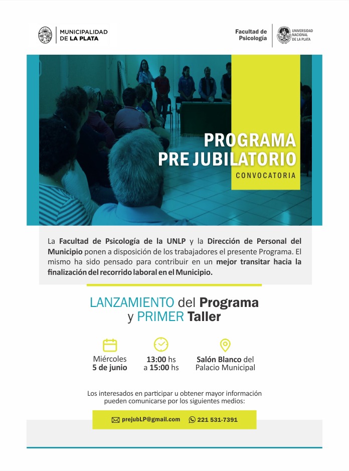 En ese sentido, el miércoles 5 de junio, de 13 a 15, en el Salón Blanco del Palacio Municipal (12 y 51), la Dirección de Personal y Capital Humano de la Comuna junto a profesionales de la Casa de Altos Estudios darán comienzo a una serie de encuentros con formato de taller que tendrán por objetivo acompañar a trabajadores municipales tiempo antes de la finalización del recorrido laboral y promover la puesta en marcha de nuevos proyectos ocupacionales.