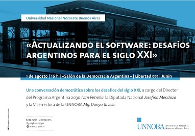 La actividad es promovida como una "conversación democrática sobre los desafíos del siglo XXI" en materia digital y estará a cargo del director del Programa Argentina 2030, Iván Petrella; la diputada Nacional Josefina Mendoza y la vicerrectora de la UNNOBA, Danya Tavela.