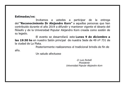 El evento se desarrollará este lunes 9 de diciembre a las 19:30 hs en nuestro Salón principal de nuestra Sede de 49 nº 731 y en esta oportunidad serán reconocidos: Dr Osvaldo Graciano, Sra Cristina Espinosa, Sra Gladys Caporal, Dr Gabriel Chapunov, Lic Inka von Liden, Prof Adrián Adrian Celentano, Lic Damián Stiglitz, Sr. Ricardo Cadenas, Sr Henry Stegmayer, Sr Facundo Gabriel Adorno , Maria Jose Pinardel y Linet Zaragoza.
