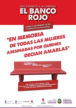 En el marco del Día Internacional de la Mujer, la Facultad de Ciencias Jurídicas y Sociales de la Universidad Nacional de La Plata se suma a la Campaña Internacional Banco Rojo, en memoria de todas las mujeres que murieron por quienes decían amarlas e invita a toda la comunidad académica a participar el lunes 9 de marzo, a las 18, en la puerta del Edificio de la Reforma (Calle 48 entre 6 y 7).