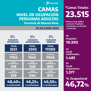 Ocupación de CAMAS de ADULTOS de toda la Provincia de Buenos Aires de cuidados intensivos, medios y mínimos de hospitales municipales, provinciales y nacionales del sector público y privado.