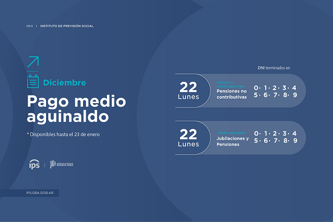 El Instituto de Previsión Social (IPS) informa que las personas jubiladas y pensionadas de la provincia de Buenos Aires percibirán el medio aguinaldo - SAC proporcional- el próximo lunes 22 de diciembre, según calendario que se detalla a continuación: